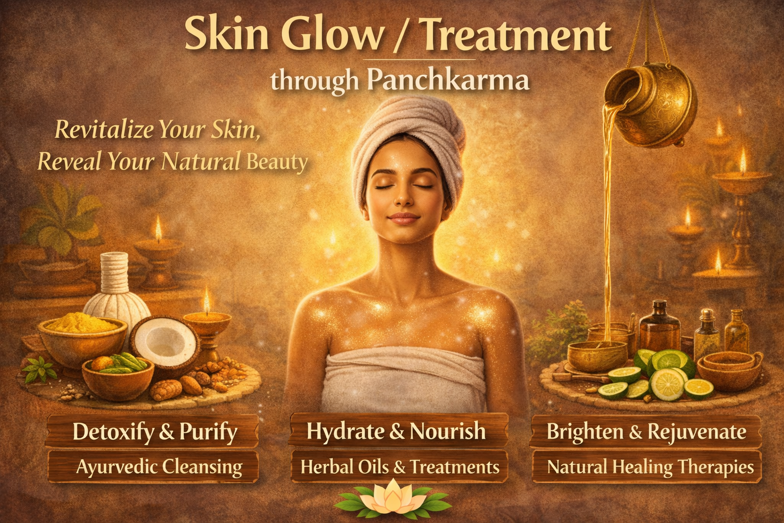 Skin Glow Treatment through Panchkarma is a natural Ayurvedic approach that detoxifies the body and enhances the skin’s radiance from within. This therapy focuses on eliminating toxins, improving blood circulation, and nourishing the skin using herbal oils and traditional cleansing techniques. Panchkarma treatments like Abhyanga (oil massage) and Swedana (steam therapy) help open pores, remove impurities, and restore the skin’s natural balance. It not only improves complexion but also reduces acne, pigmentation, and dullness. By rejuvenating the body and calming the mind, Panchkarma promotes healthy, glowing, and youthful skin in a safe and holistic way.