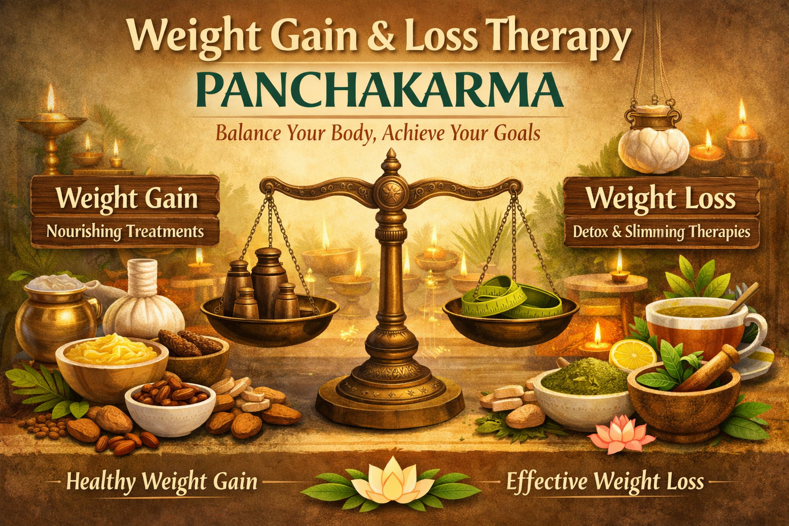 Panchakarma offers a comprehensive Ayurvedic approach to weight management by detoxifying the body, balancing doshas (especially Kapha), and boosting metabolism through procedures like Vamana, Virechana, Basti, and Udwarthanam. Targeted treatments, such as dry powder massages (Udwarthanam) and medicated enemas (Basti), help reduce stubborn fat, improve digestion, and support sustainable, long-term weight reduction rather than just temporary loss.